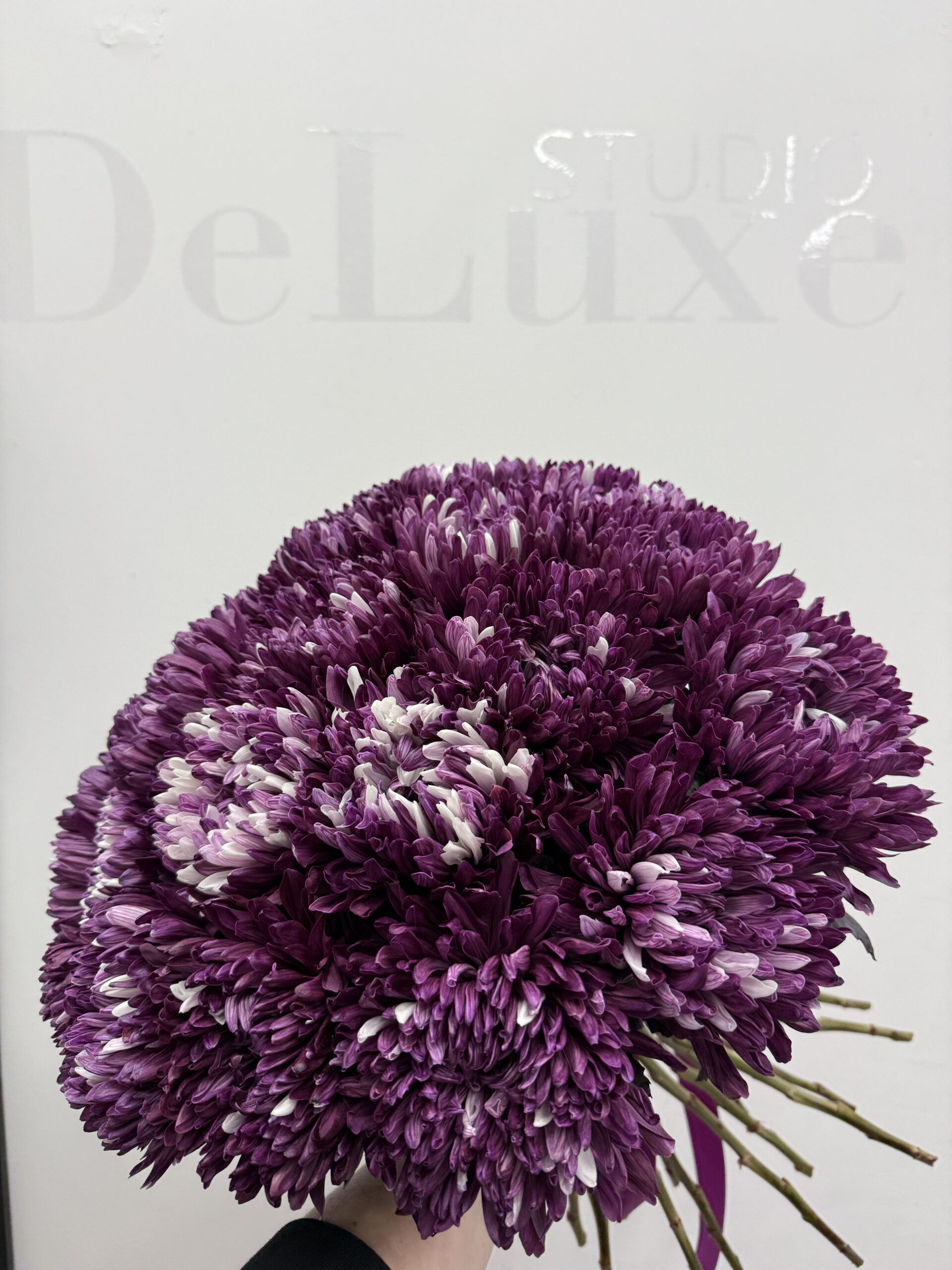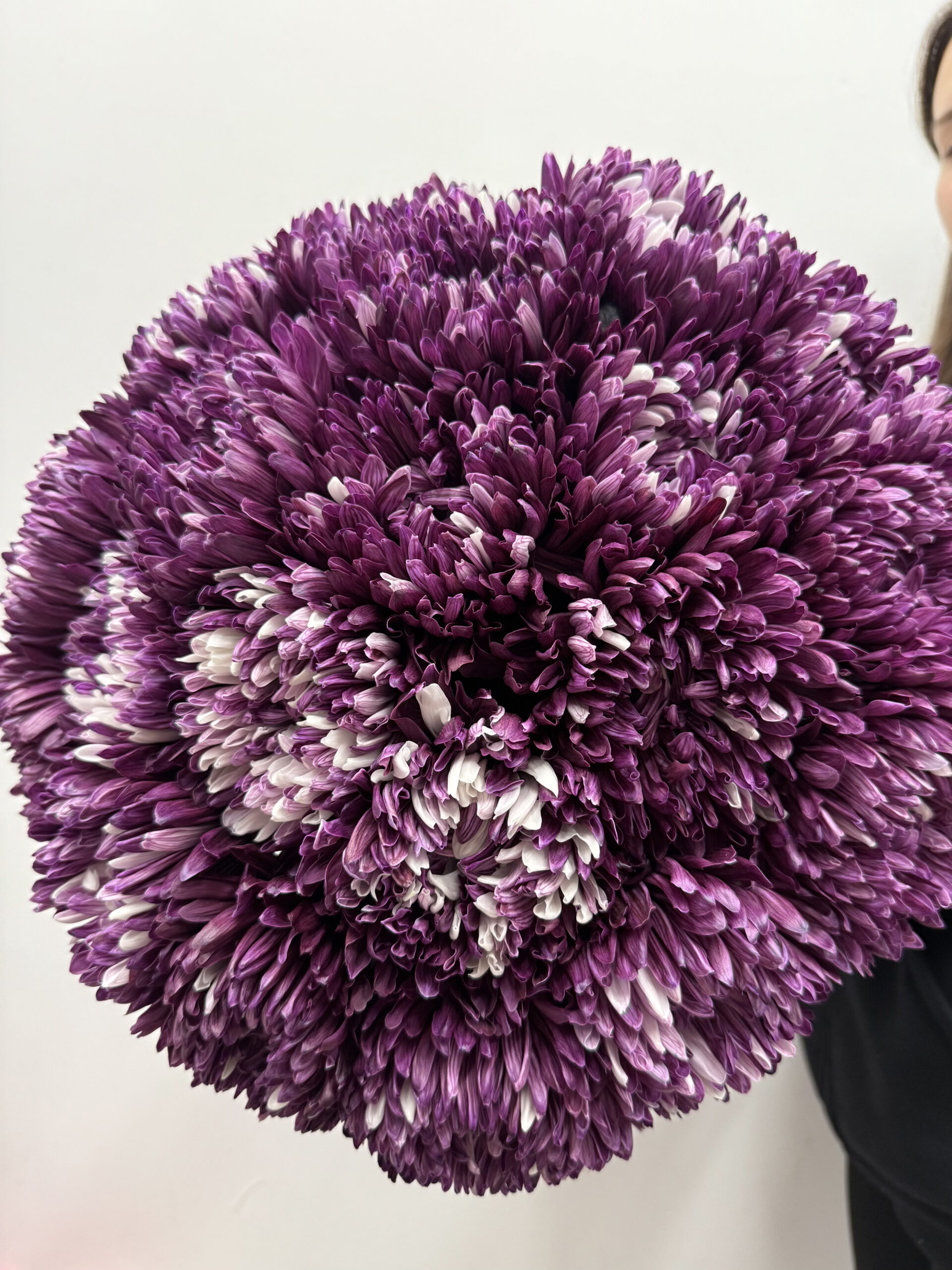 Ten spektakularny bukiet z fioletowej chryzantemy zachwyca intensywną barwą oraz dwukolorowymi płatkami w odcieniach fioletu i bieli. Kwiaty są duże, bardzo gęste i tworzą efektowną, kulistą kompozycję, która przyciąga spojrzenia z daleka.