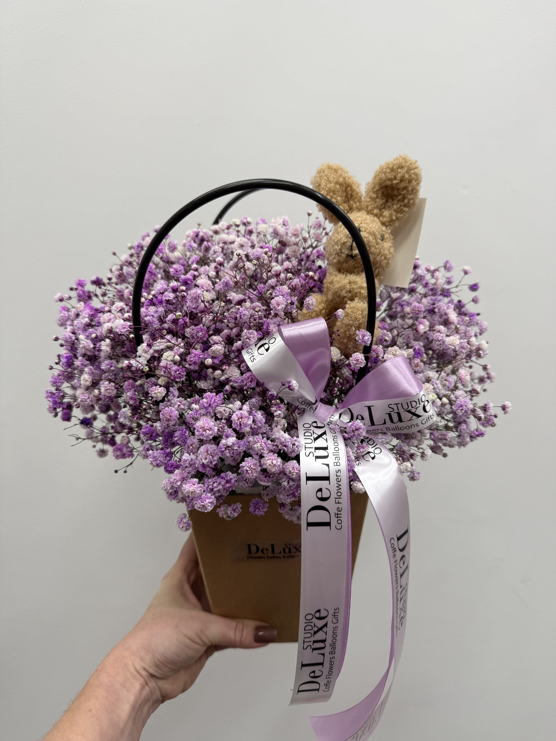 Delikatna fioletowa gipsówka w torebce – subtelna i romantyczna kompozycja od Studio Deluxe w Poznaniu. Idealny prezent lub dekoracja.