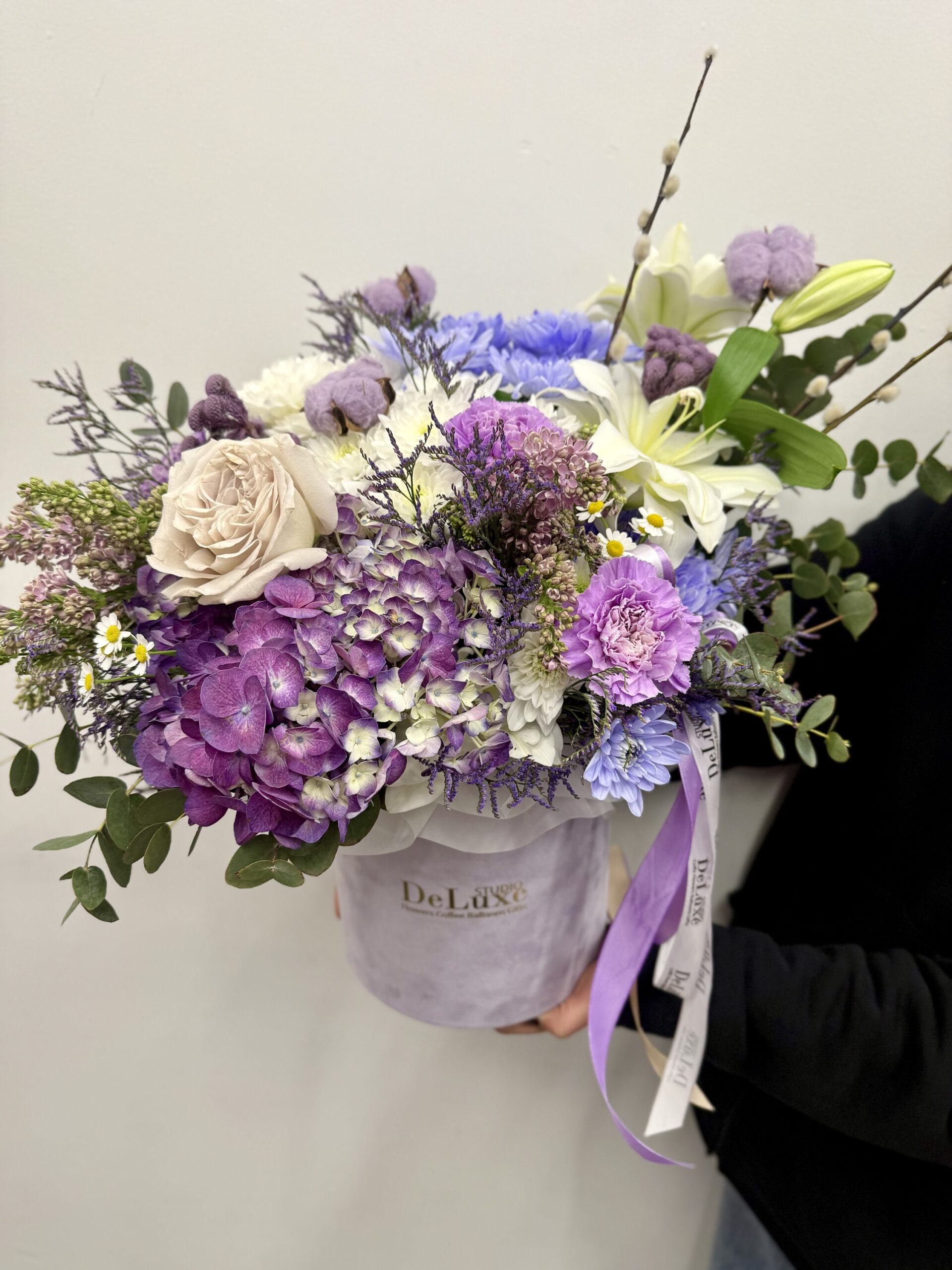 Flowerbox z hortensją, różą, eustomą i lilią to elegancka kompozycja kwiatowa w pudełku, która łączy w sobie objętość, delikatność i wyrafinowany styl. Starannie dobrane kwiaty w odcieniach fioletu, bieli i pasteli tworzą harmonijną i luksusową aranżację. W skład flowerboxa wchodzą hortensja, róże ogrodowe, eustoma, lilie, goździki oraz dodatki sezonowe i zieleń dekoracyjna. Jeśli szukasz więcej podobnych kompozycji, sprawdź nasze flowerboxy lub stylowe bukiety mieszane. Hortensja nadaje kompozycji objętości i miękkiej formy, róże wprowadzają elegancję i romantyczny charakter, eustoma podkreśla lekkość, a lilie dodają wyrazistości i subtelnego zapachu. Całość tworzy spójną, bogatą i nowoczesną композицию. Flowerbox z hortensją, różą, eustomą i lilią doskonale sprawdzi się jako prezent na urodziny, rocznicę, Dzień Kobiet lub jako elegancki gest bez okazji. To idealny wybór dla osób, które cenią styl premium i wygodę. Dzięki zastosowaniu gąbki florystycznej kwiaty mają stały dostęp do wody, co pozwala im dłużej zachować świeżość. Flowerbox nie wymaga wazonu, co czyni go praktycznym i nowoczesnym rozwiązaniem prezentowym. Każda kompozycja tworzona jest indywidualnie, dlatego może się nieznacznie różnić w zależności od dostępności kwiatów, zachowując jednak styl i kolorystykę zbliżoną do zdjęcia. Do flowerboxa możesz dobrać dodatki, takie jak balony, słodycze lub pluszaki, aby stworzyć wyjątkowy zestaw prezentowy. Zobacz więcej naszych realizacji: @studiodeluxe_pl Na zdjęciu flowerbox z hortensją, różami, eustomą i lilią w pastelowo-fioletowej kolorystyce.