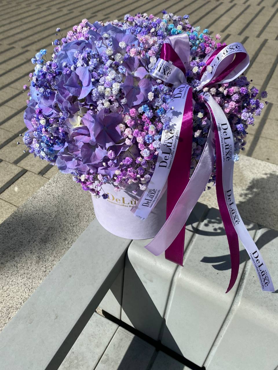 Elegancki flowerbox z hortensji i gipsówki w pastelowych kolorach. Subtelna kompozycja idealna na prezent i dekorację.
