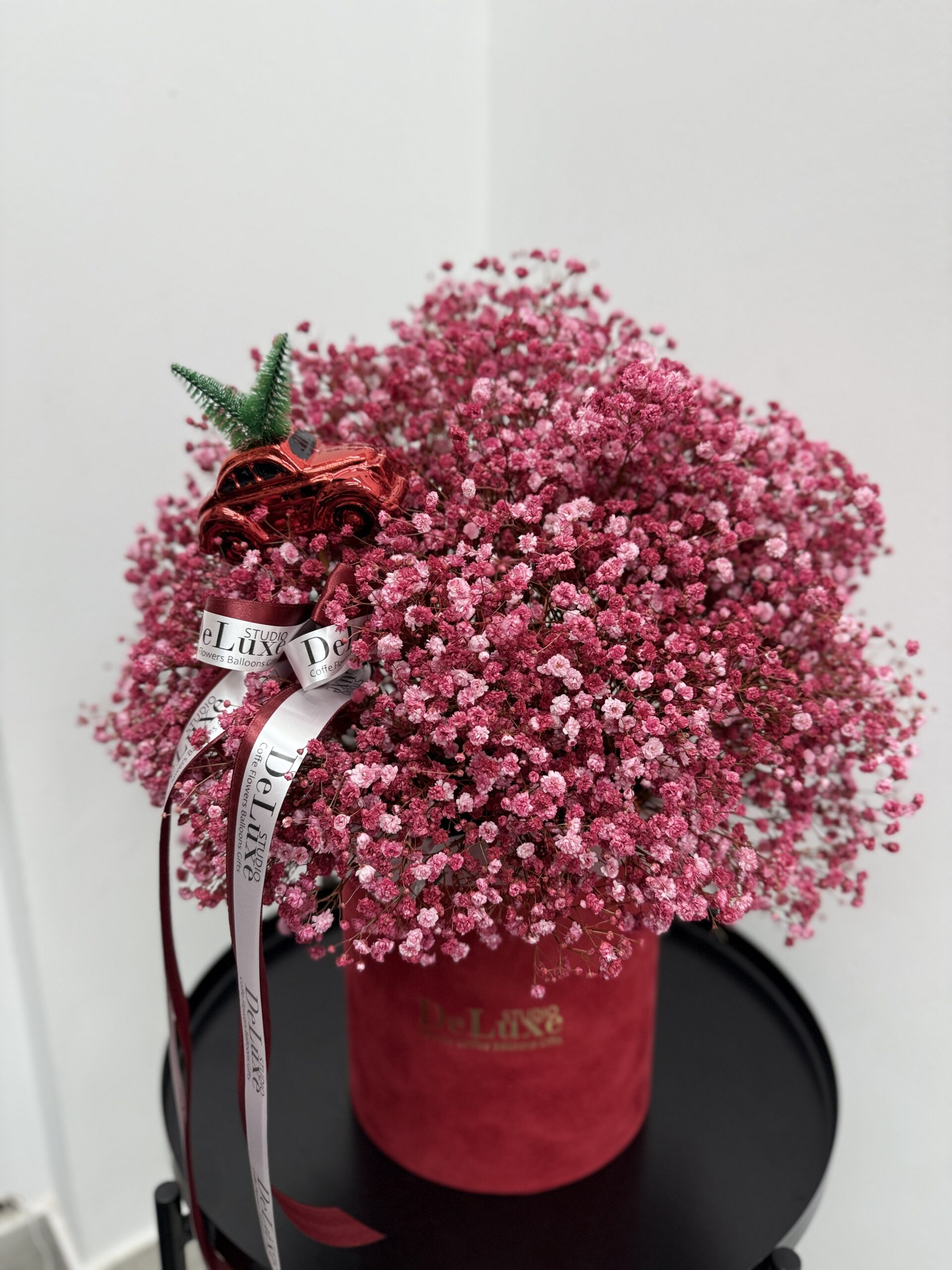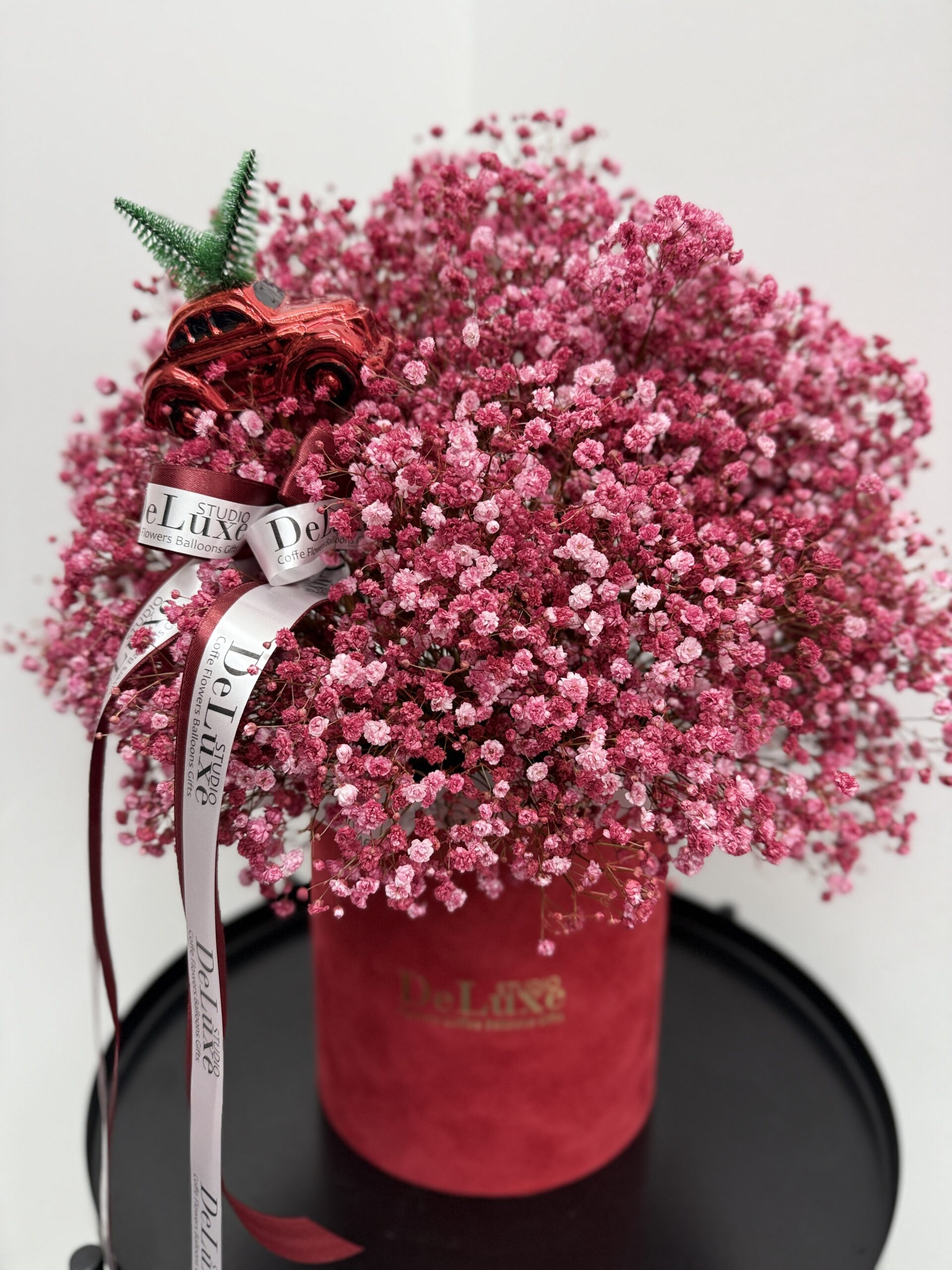 W skład kompozycji wchodzi: – gipsówka w odcieniach różu, – dekoracyjne dodatki świąteczne (samochód z choinką), – elegancki welurowy box, – wstążki firmowe Studio Deluxe.