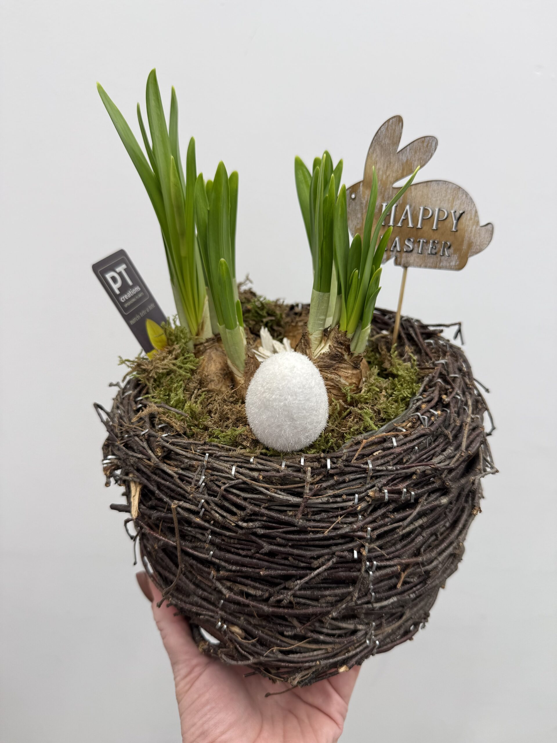 Kompozycja wielkanocna z żonkilami w koszyku to urocza, naturalna dekoracja inspirowana wiosną i świątecznym klimatem. Świeże cebulki żonkili w połączeniu z mchem i dekoracyjnym gniazdem tworzą spójną, lekką kompozycję idealną na Wielkanoc. W skład aranżacji wchodzą cebulki żonkili, naturalny mech oraz ozdobne elementy wielkanocne, takie jak dekoracyjne jajko i drewniana figurka z napisem „Happy Easter”. Całość umieszczona jest w stylowym koszyku, który podkreśla naturalny charakter kompozycji. Jeśli szukasz więcej sezonowych inspiracji, sprawdź nasze kompozycje kwiatowe oraz wyjątkowe dekoracje i dodatki. Kompozycja wielkanocna z żonkilami doskonale sprawdzi się jako dekoracja stołu, prezent dla bliskiej osoby lub element świątecznego wystroju wnętrza. Żonkile symbolizują nowy początek, radość i wiosnę, dzięki czemu idealnie wpisują się w klimat Wielkanocy. Rośliny w formie cebulek mogą dalej rosnąć, co sprawia, że kompozycja jest nie tylko dekoracją, ale również żywym elementem, który będzie cieszył przez dłuższy czas. Po przekwitnięciu można je przesadzić, aby kontynuować ich wzrost. Każda kompozycja przygotowywana jest ręcznie, dlatego może się nieznacznie różnić układem elementów oraz dodatkami, z zachowaniem stylu i charakteru przedstawionego na zdjęciu. To idealny wybór dla osób, które cenią naturalne, minimalistyczne dekoracje oraz chcą wprowadzić do wnętrza świeżość i wiosenny klimat. Zainspiruj się naszymi realizacjami: @studiodeluxe_pl Na zdjęciu wielkanocna kompozycja z żonkilami w naturalnym koszyku z dekoracyjnym jajkiem.