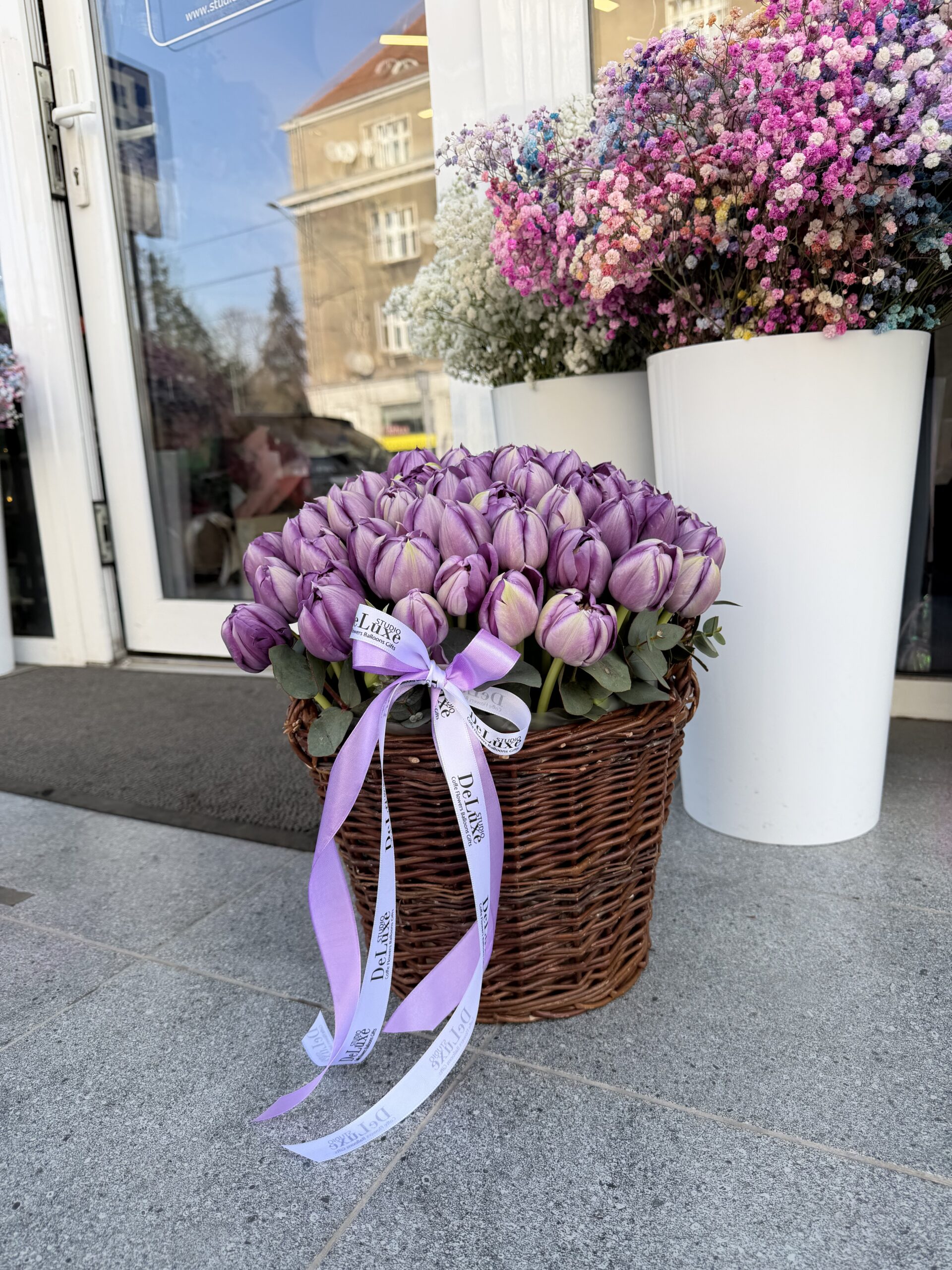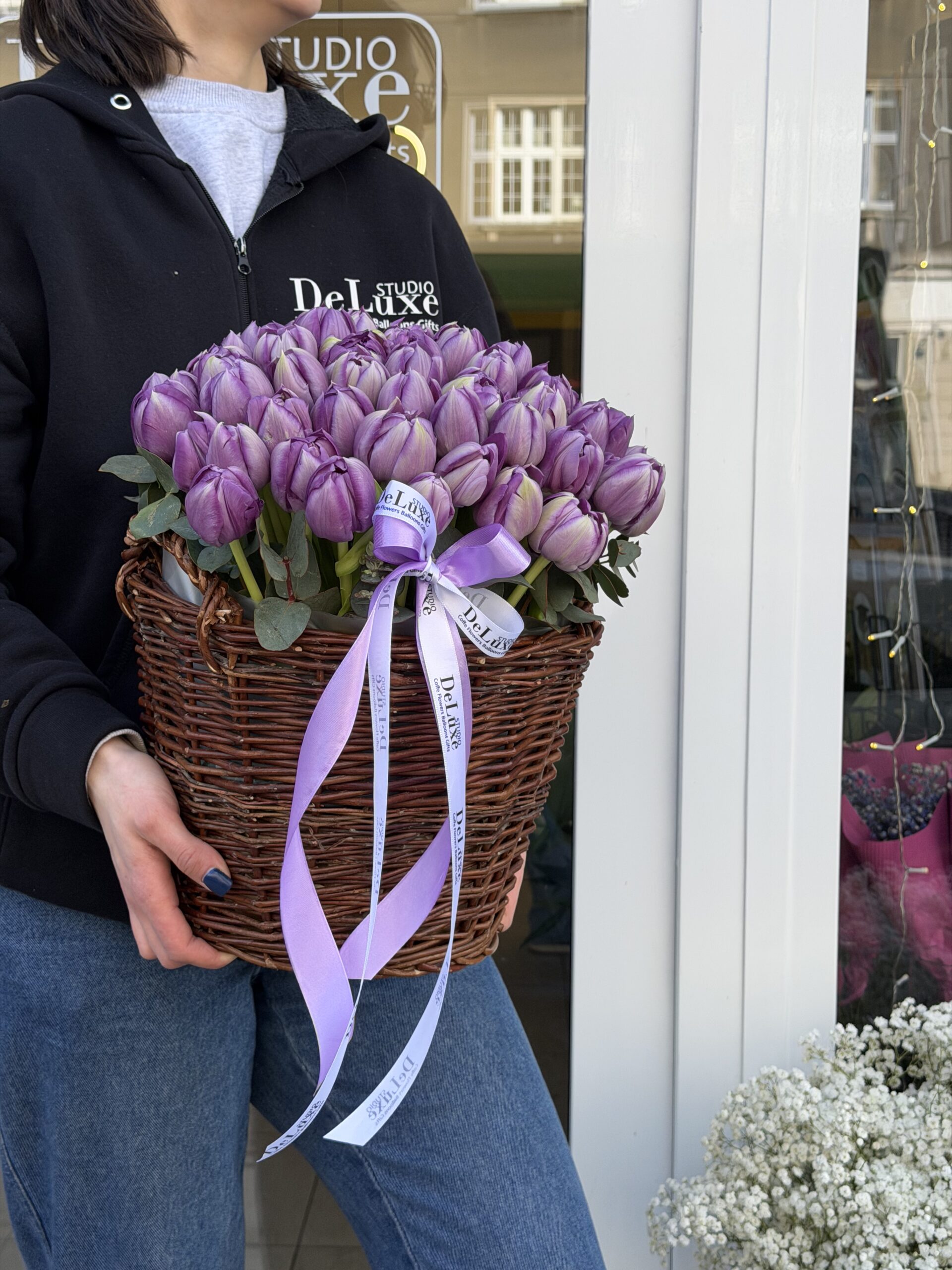 Kosz z fioletowych tulipanów z dodatkiem eukaliptusa. Elegancka kompozycja z dostawą w Poznaniu – Studio Deluxe.