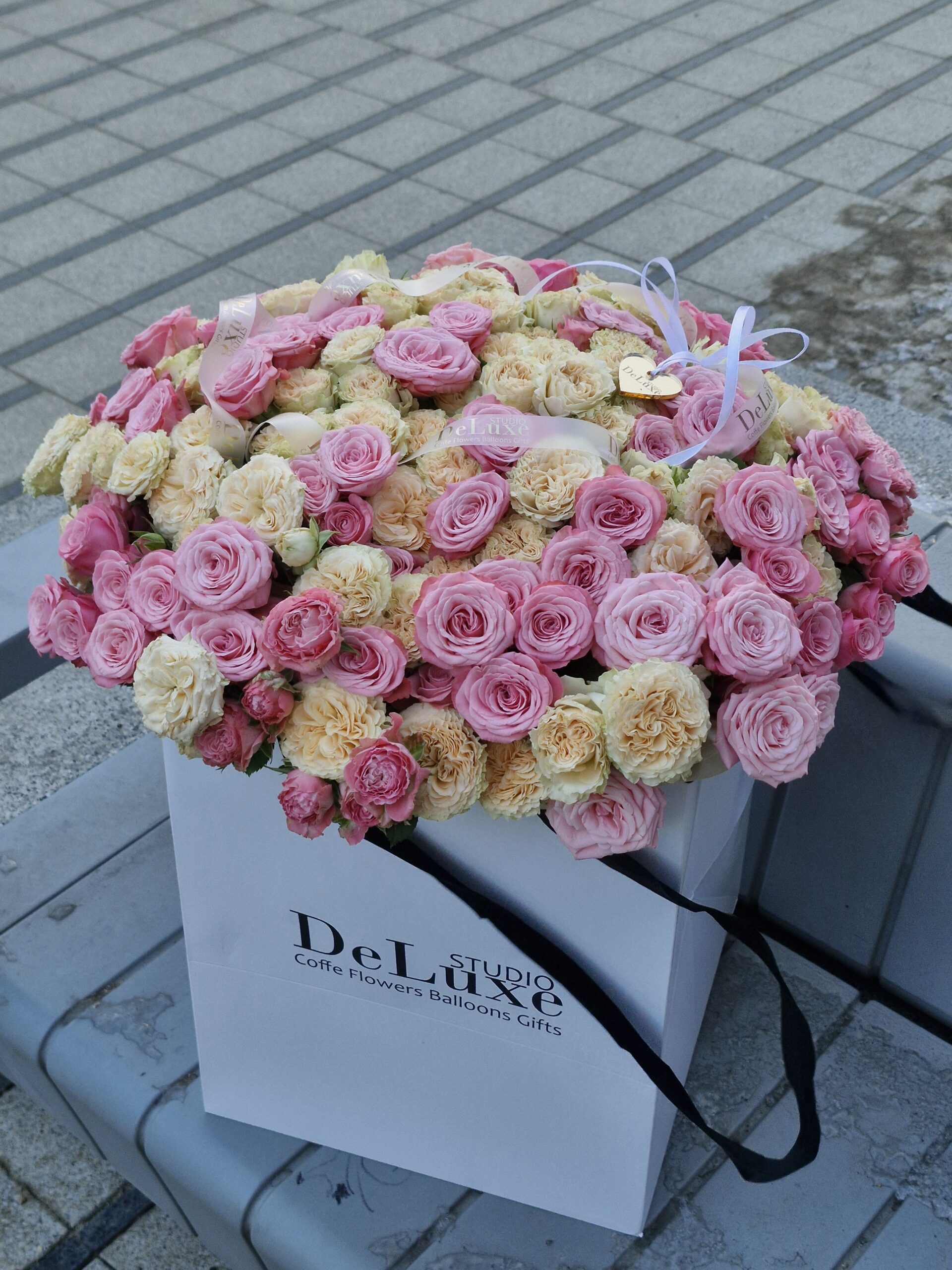 Elegancki zestaw składający się z 51 róż gałązkowych w delikatnym, harmonijnym miksie kolorów. Kompozycja zachwyca objętością, lekkością i naturalnym wyglądem drobnych kwiatów, tworząc efekt luksusowego, a jednocześnie subtelnego prezentu.