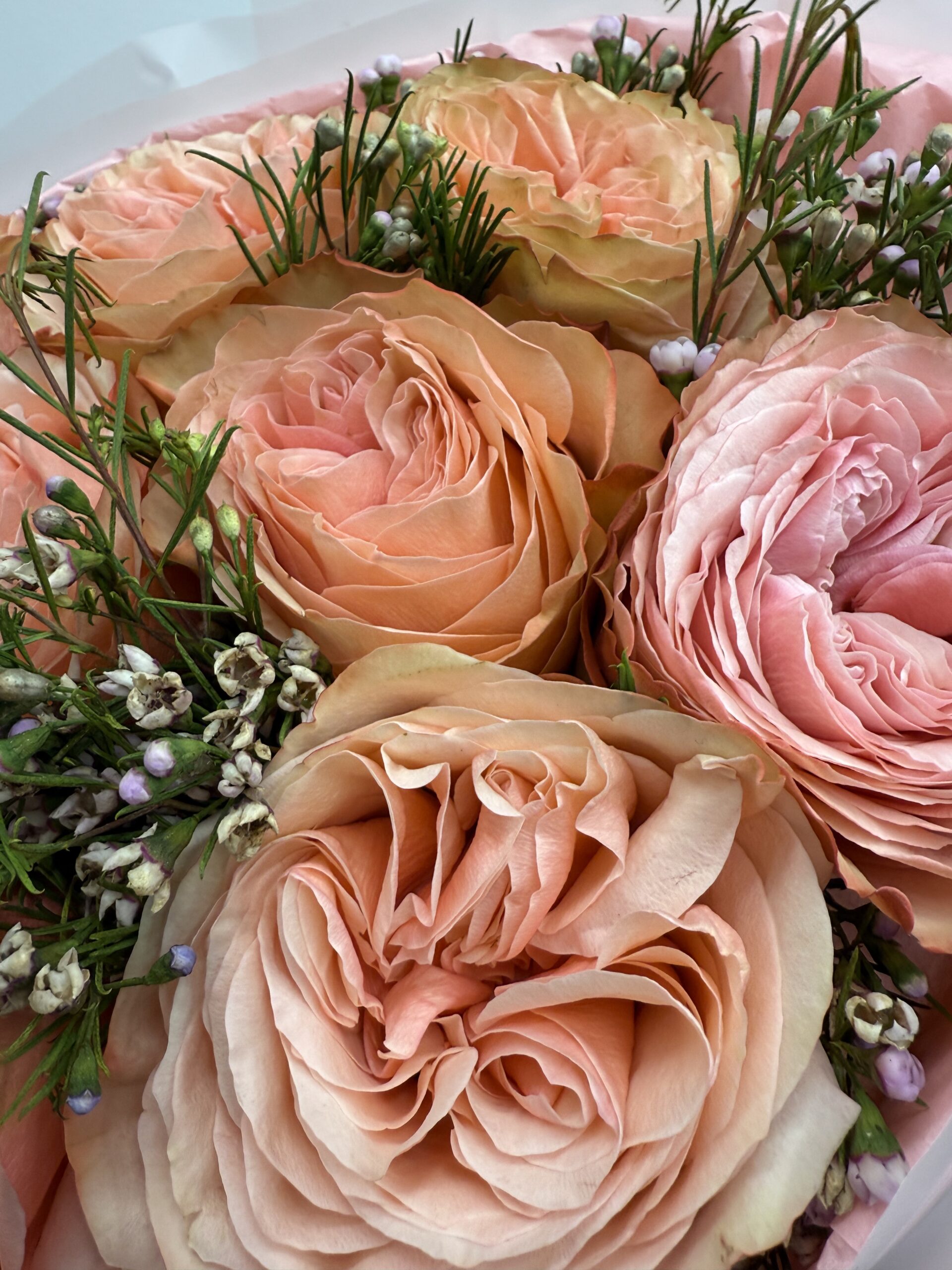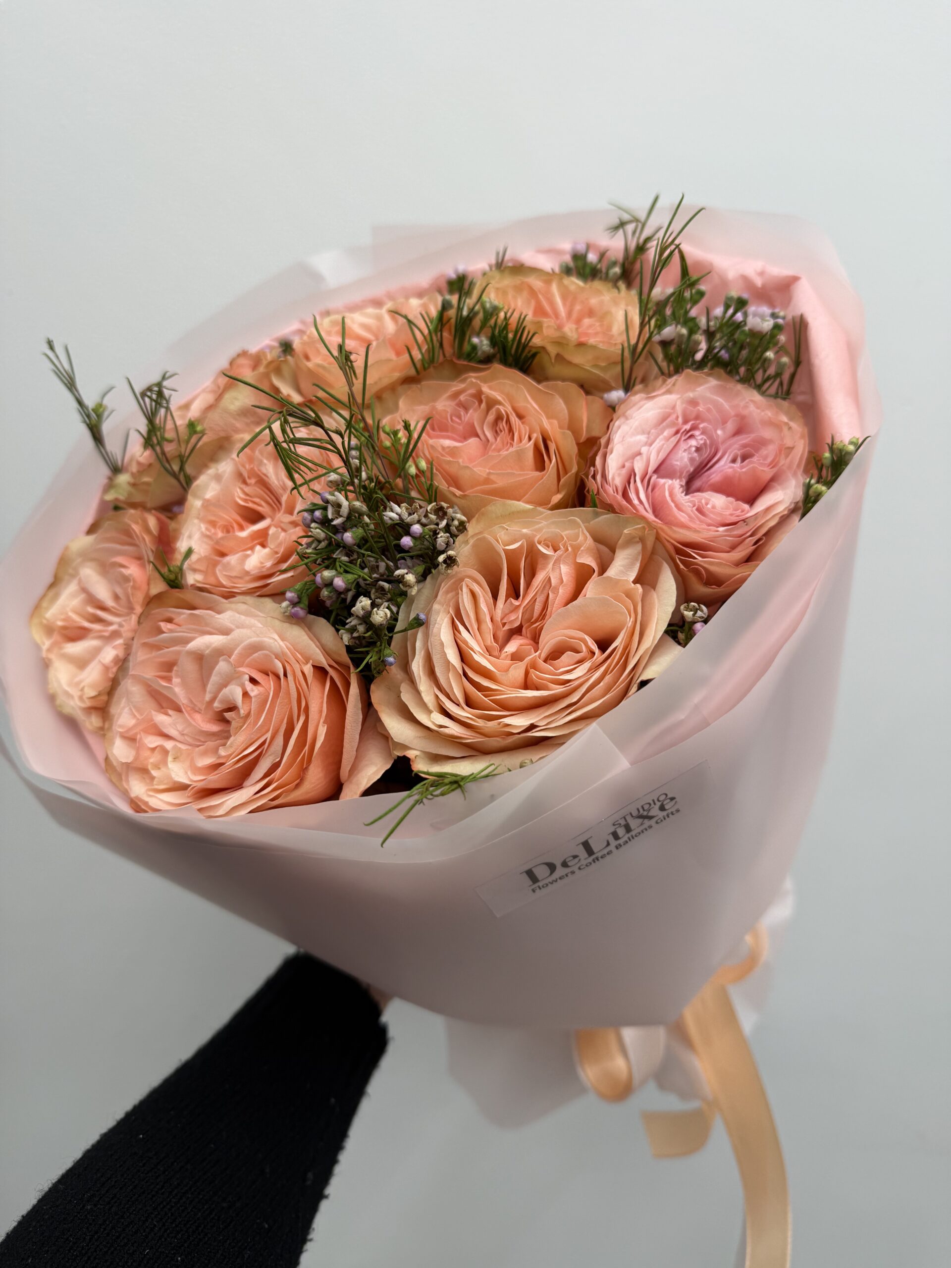 Elegancki monobukiet z brzoskwiniowych róż ogrodowych o rozetowej formie. Ręcznie tworzony bukiet w firmowym opakowaniu Studio Deluxe.
