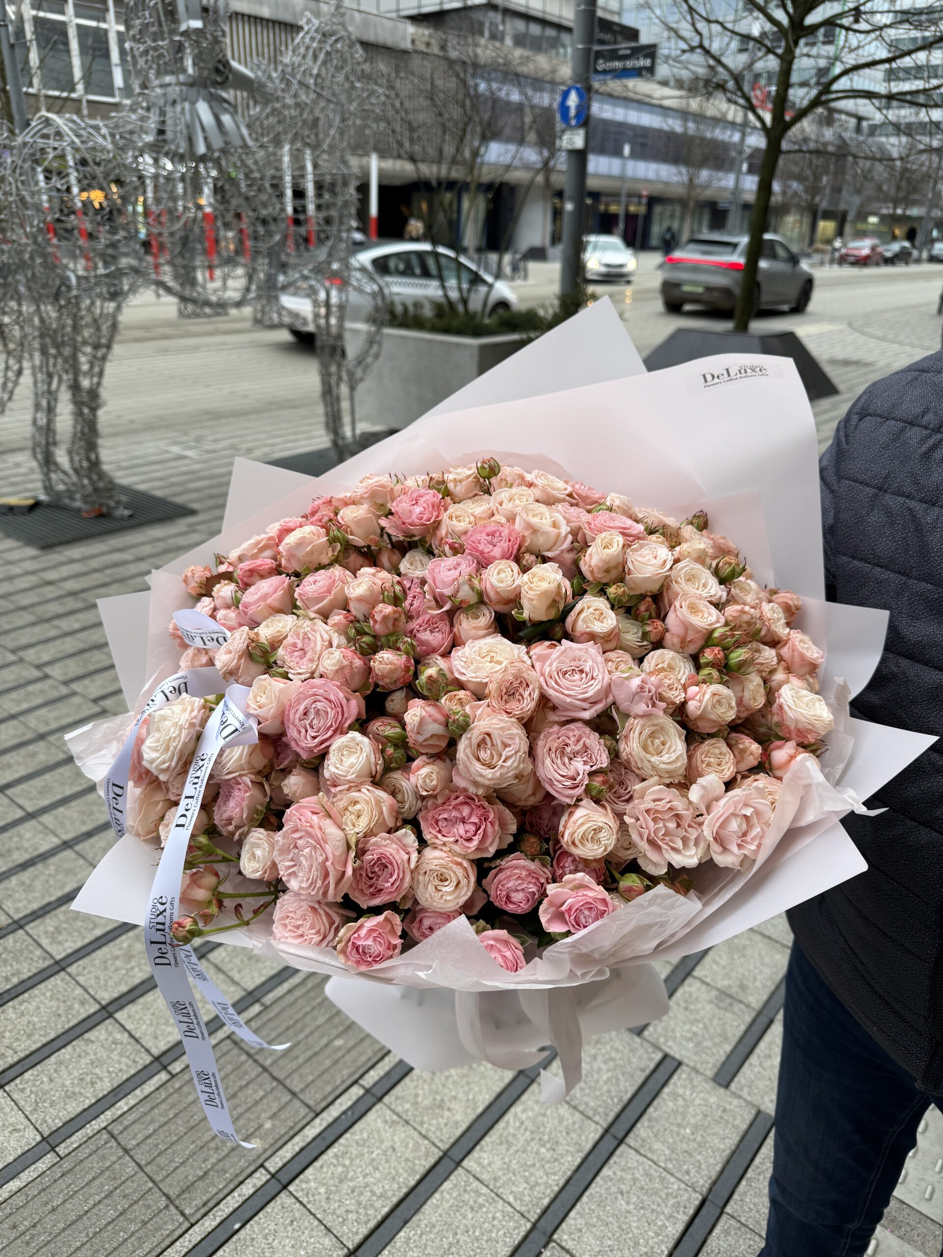 Skład bukietu: – jasnoróżowe róże gałązkowe – papier ozdobny Studio Deluxe – dekoracyjna wstążka