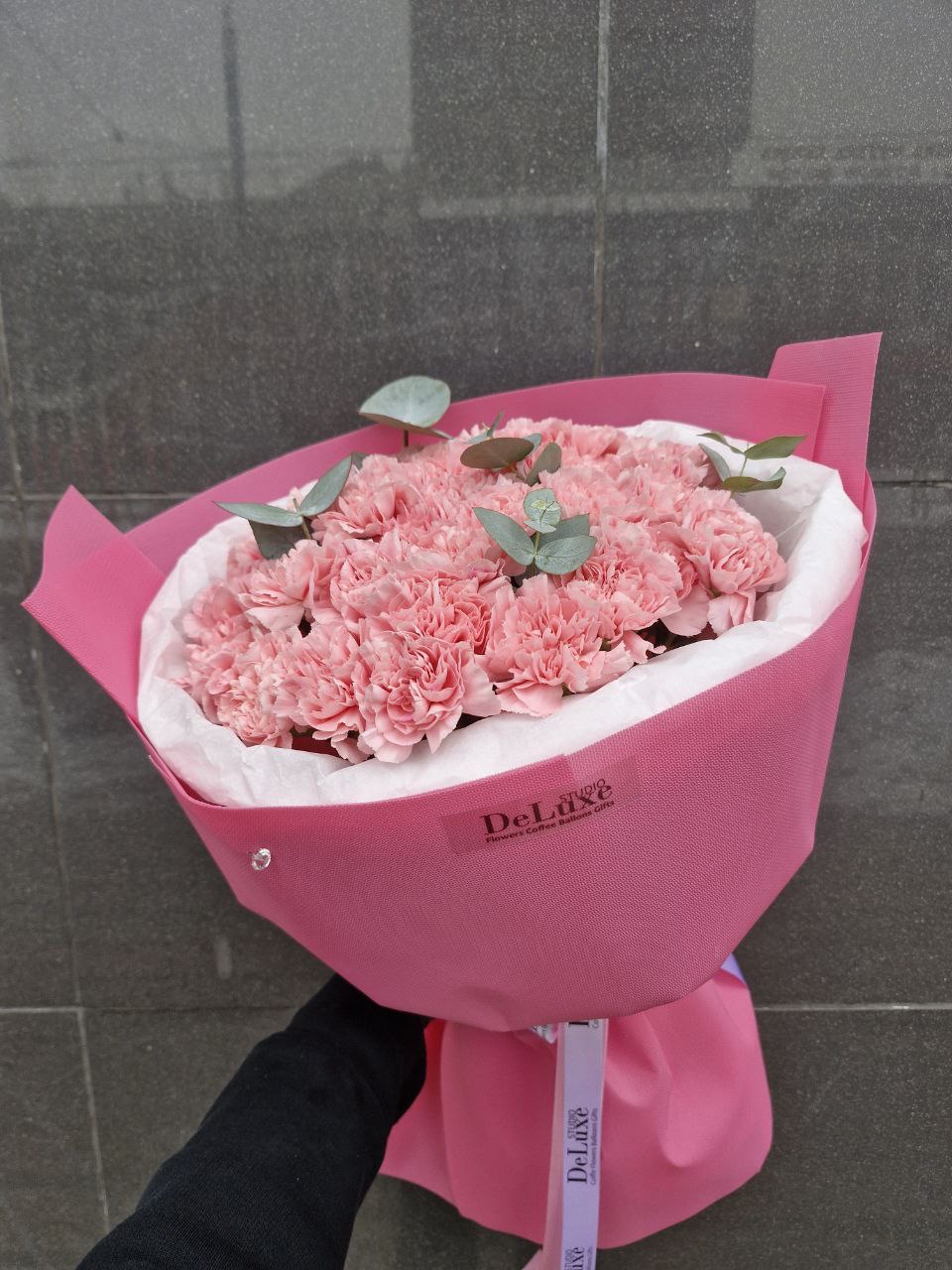 Bukiet składa się z świeżych różowych goździków, uzupełnionych naturalną zielenią eukaliptusa, która dodaje lekkości i nowoczesnego wyrazu. Całość zapakowana jest w firmowy papier Studio Deluxe.
