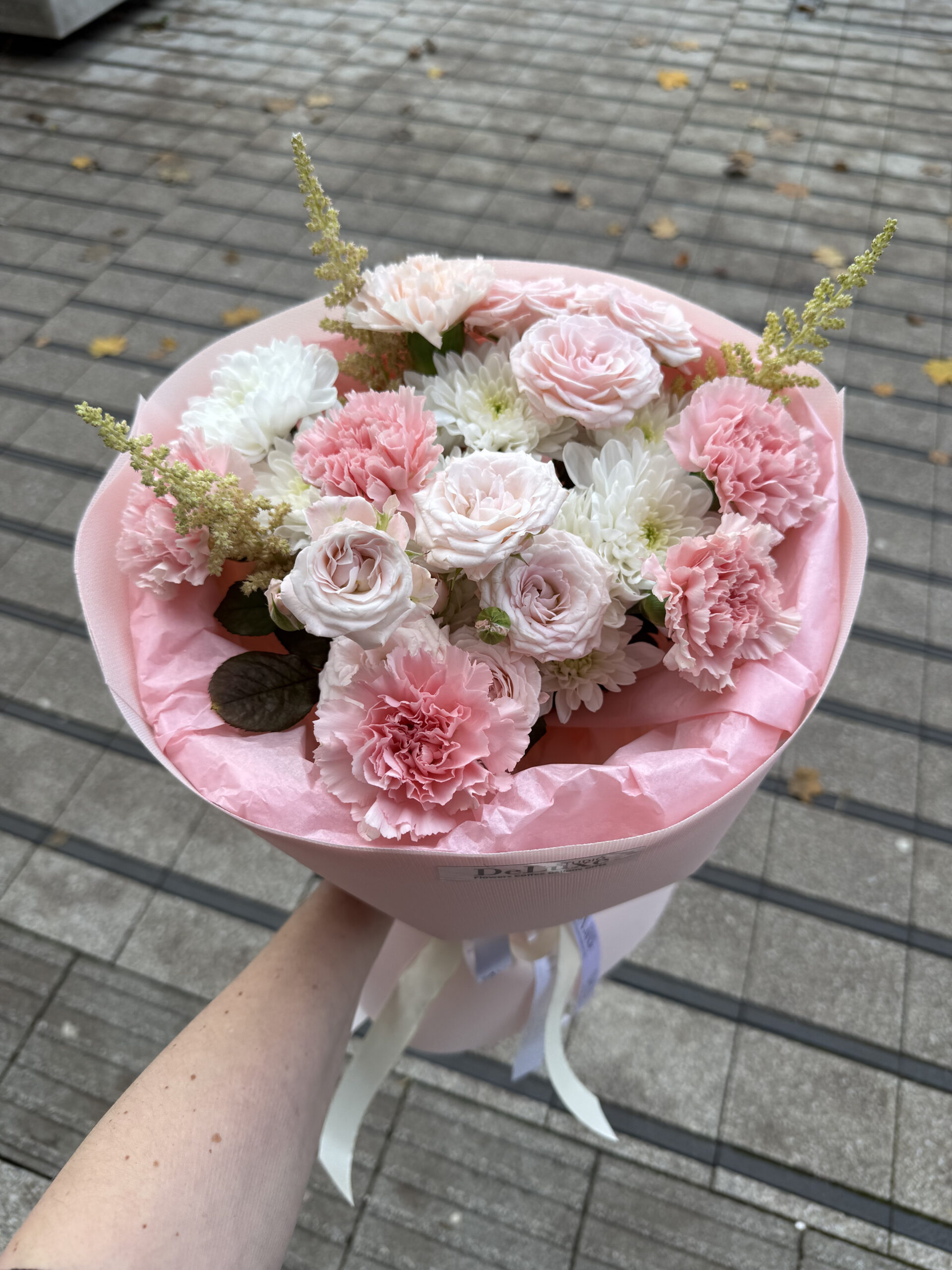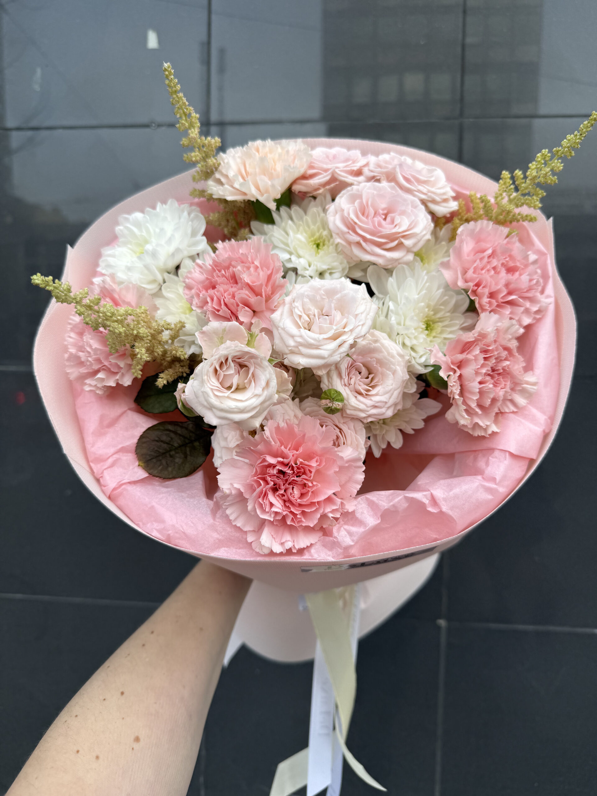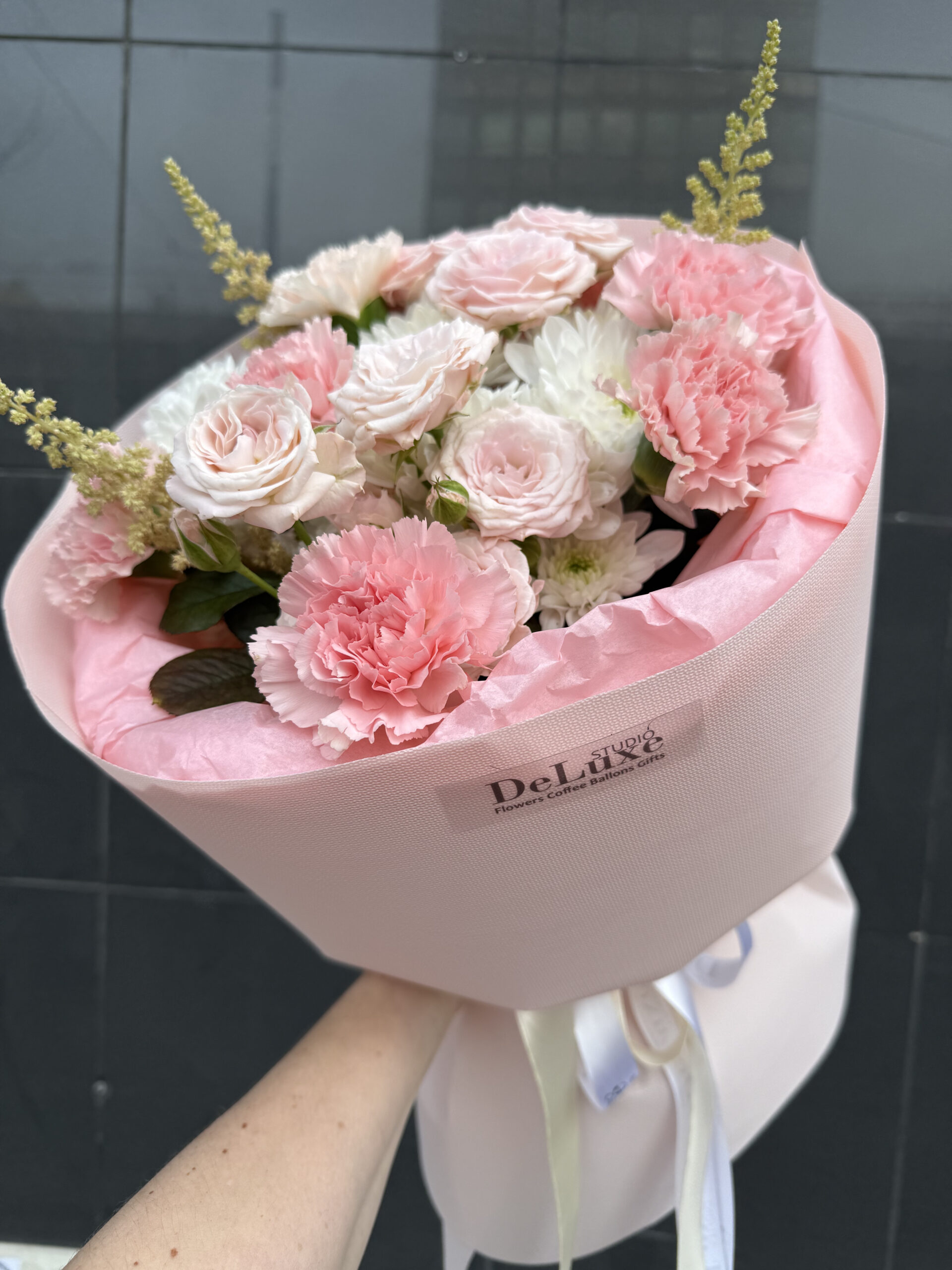 W bukiecie znajdziesz: – goździki (różowe), – róże w odcieniach pudrowych, – chryzantemy białe i pastelowe, – astilbe, – zielone dodatki.