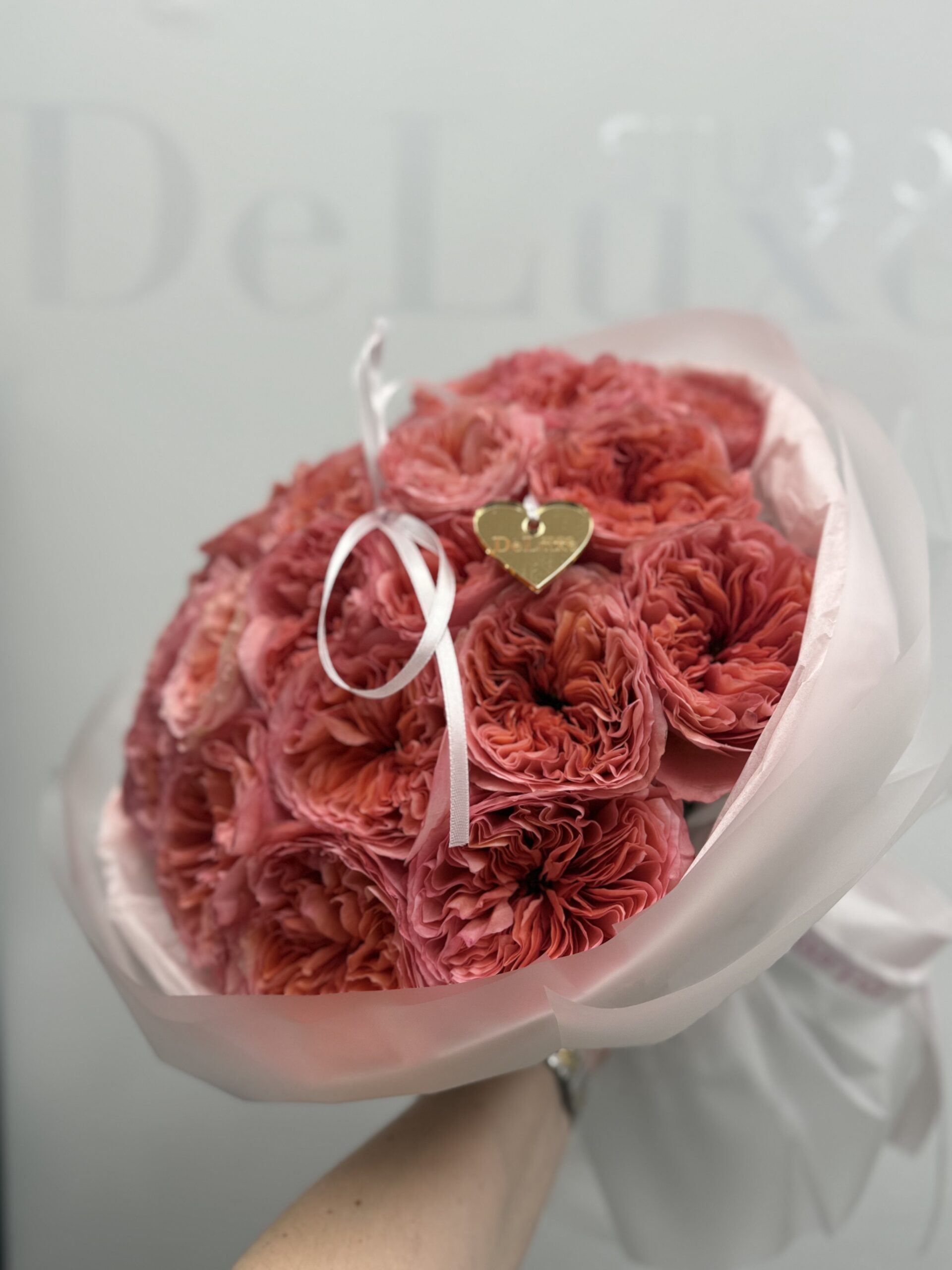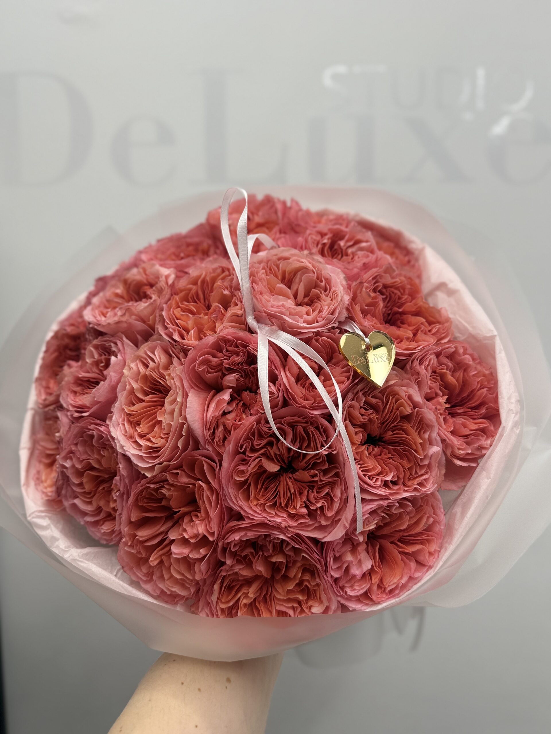 Bukiet zapakowany jest w jasne, eleganckie opakowanie z firmową wstążką Studio Deluxe i ozdobną zawieszką — gotowy do wręczenia od razu po dostawie.