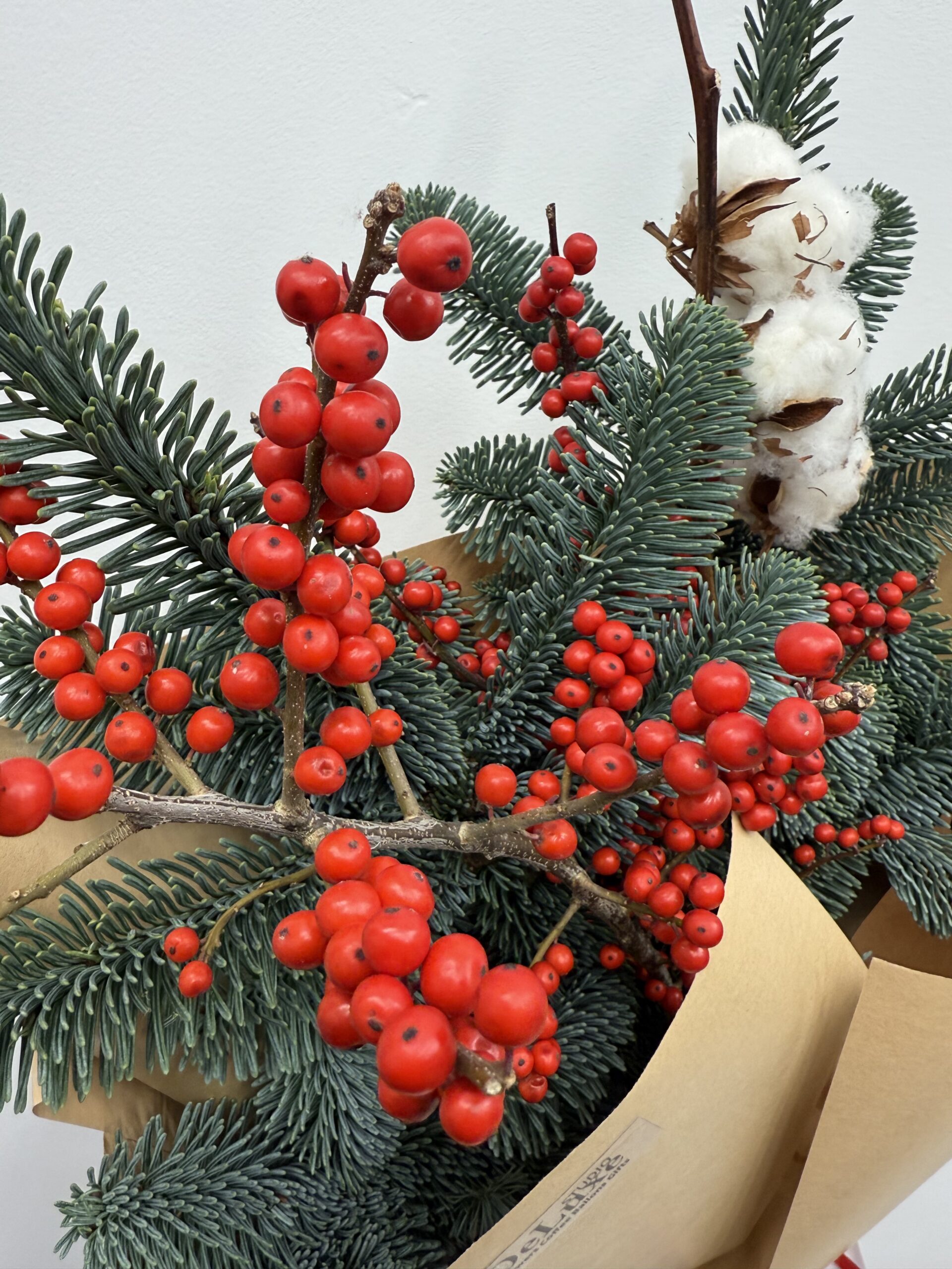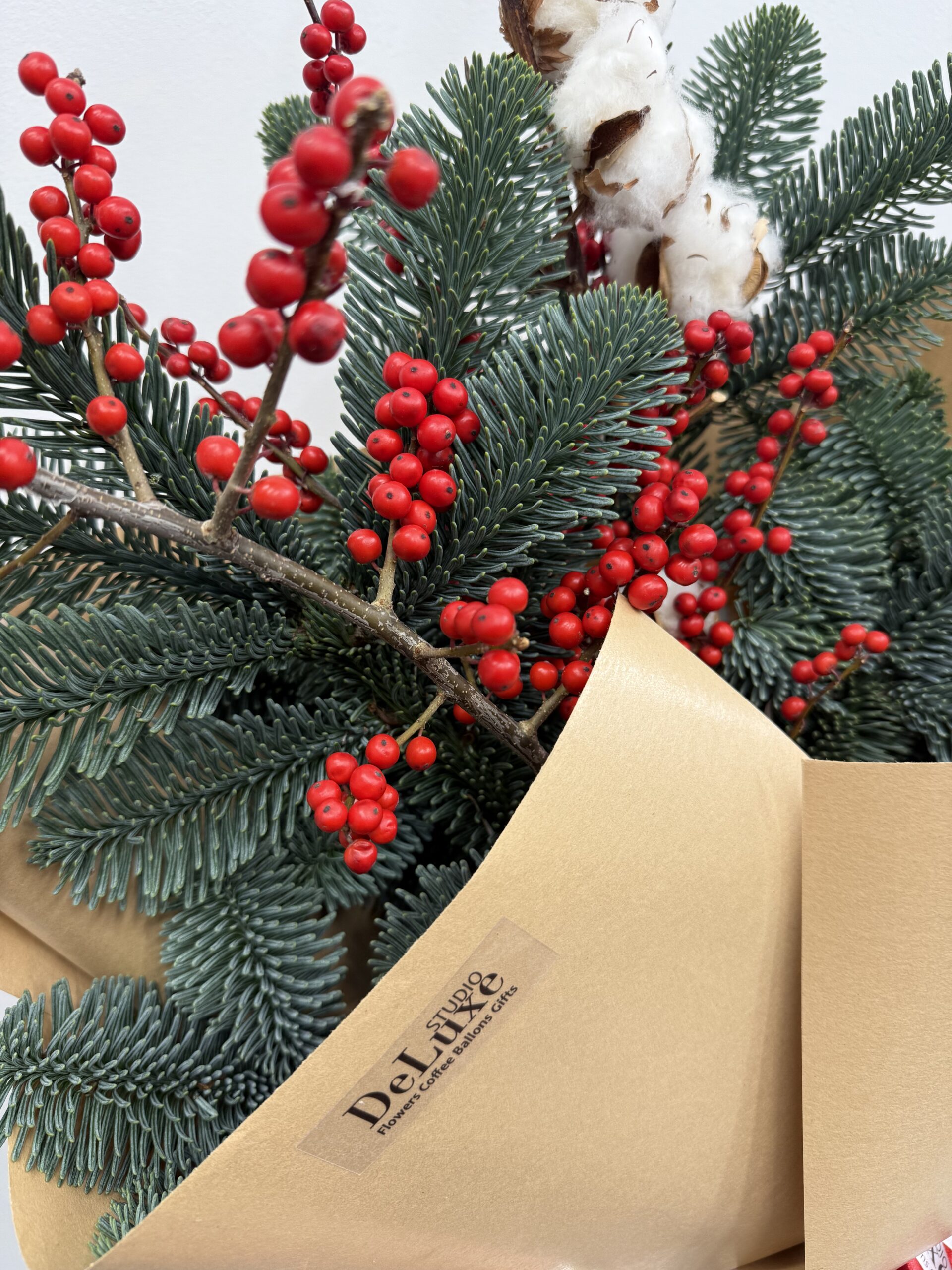 Ten elegancki, naturalny bukiet łączy czerwone jagody ilexu, gałązki świerku i bawełnę, tworząc wyjątkowo świąteczną i przytulną kompozycję. Kontrast intensywnej czerwieni z głęboką zielenią nadaje całości wyrazistości, a miękka bawełna wprowadza lekkość i ciepły zimowy charakter.