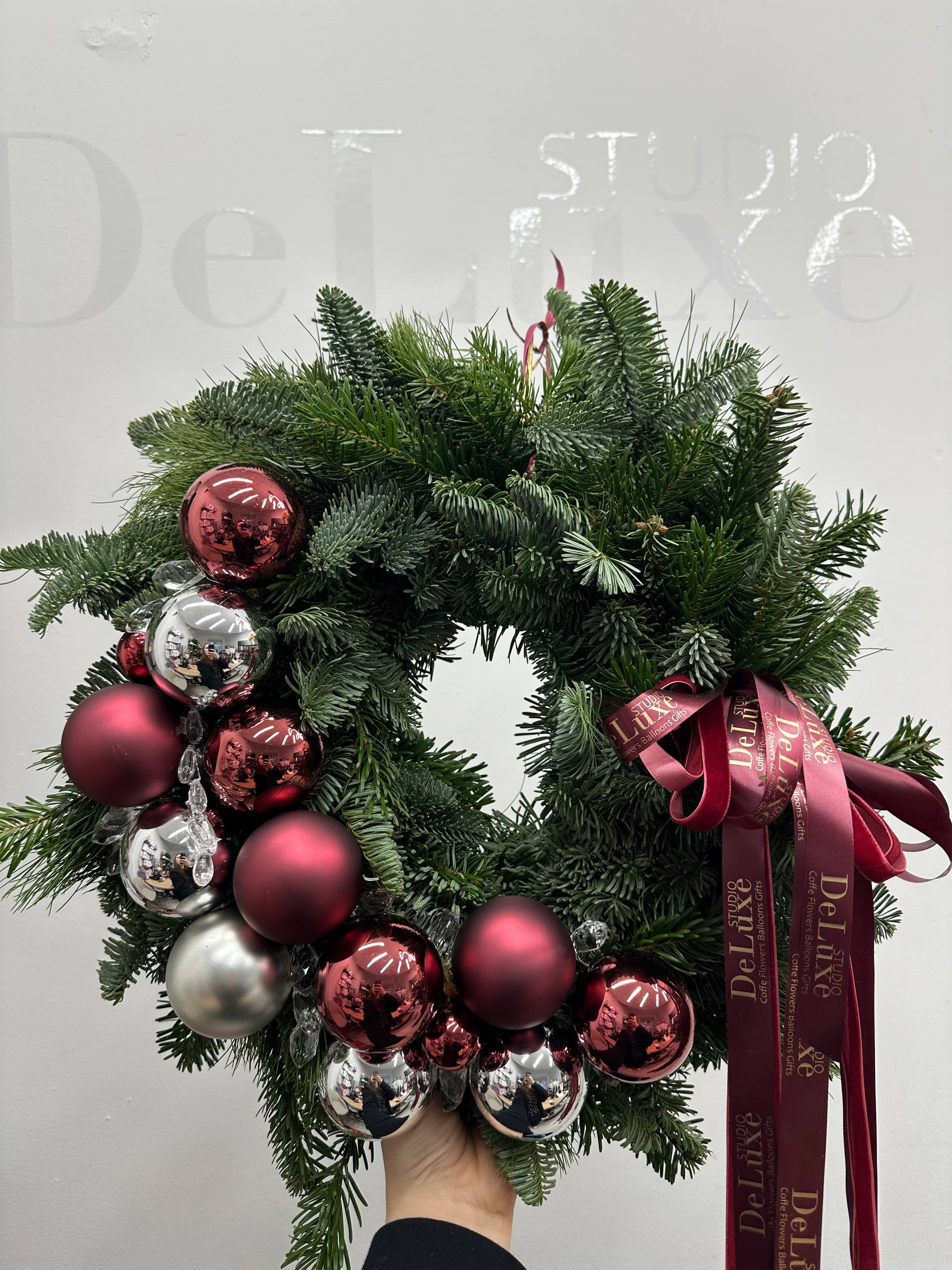 Elegancki świąteczny wianek z żywego nobilisa, ręcznie wykonany i ozdobiony bombkami w odcieniach głębokiej czerwieni oraz srebra. Naturalna zieleń igliwia pięknie kontrastuje z połyskiem dekoracji, tworząc spójną i wyważoną kompozycję.