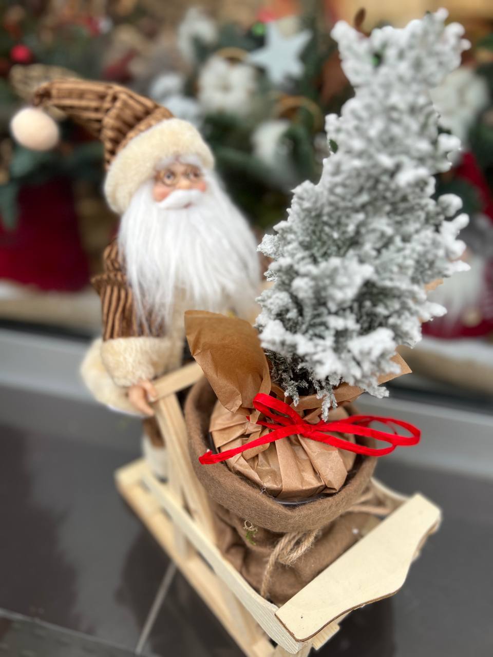 Uroczy Święty Mikołaj na saniach z mini choinką. Wyjątkowa dekoracja bożonarodzeniowa w naturalnym stylu. Studio Deluxe Poznań.
