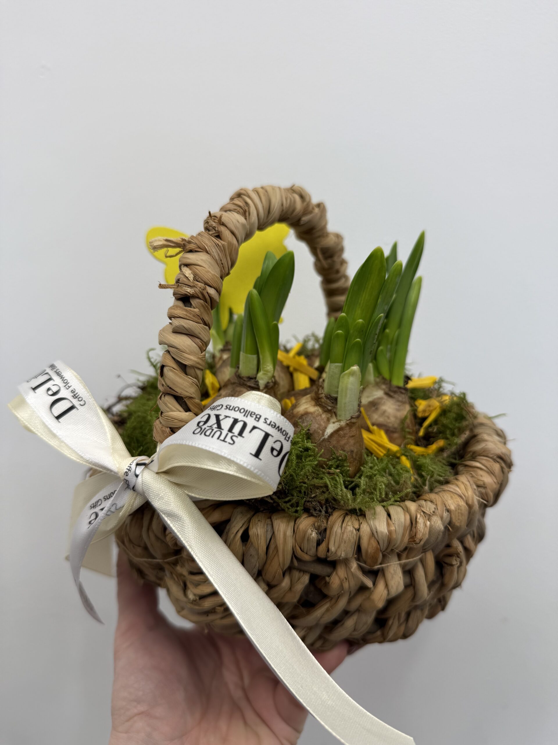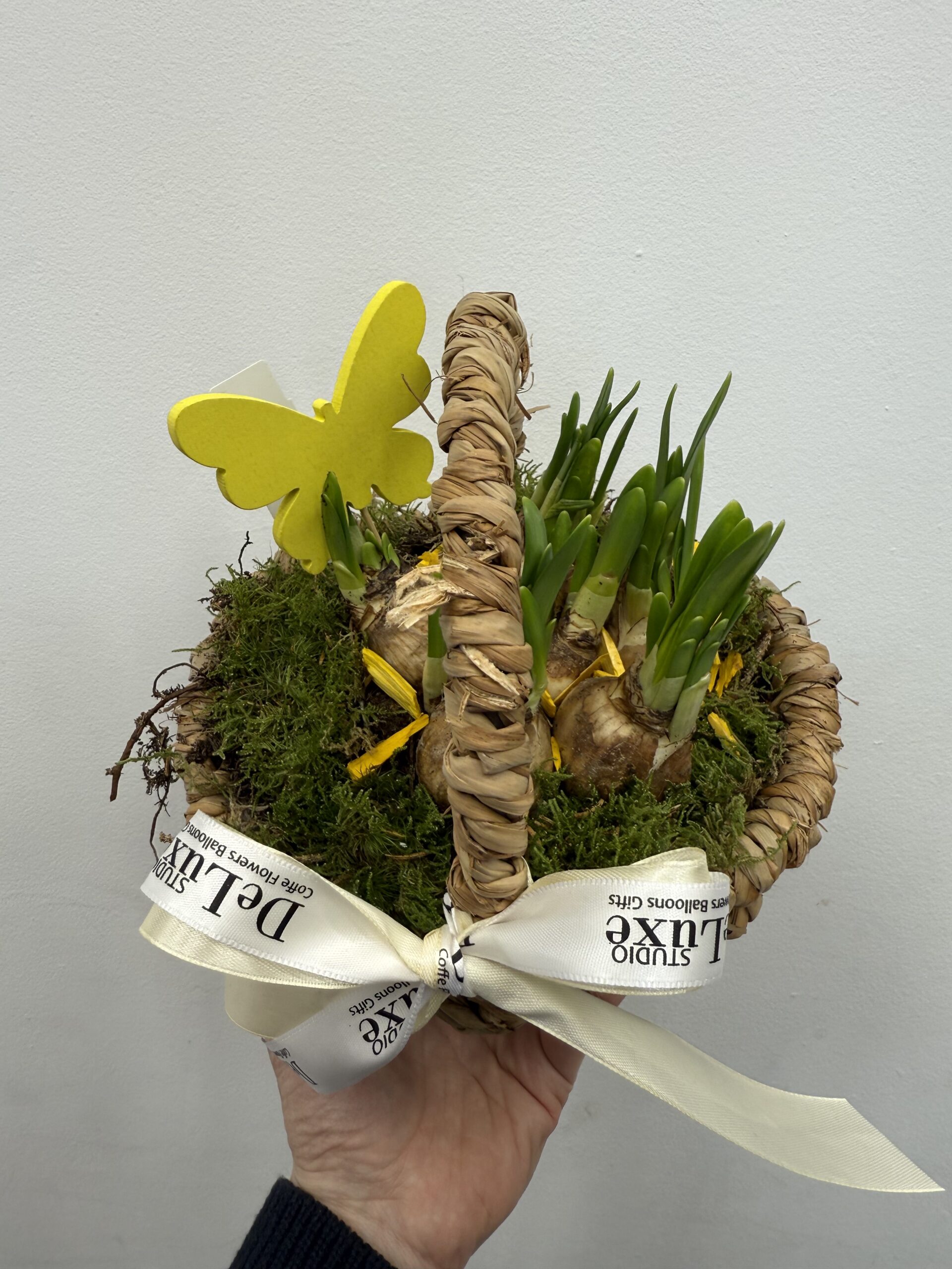 Urocza kompozycja wielkanocna w naturalnym koszyczku, stworzona z żywych roślin cebulowych i wiosennych dodatków. Świeża zieleń, delikatne żółte akcenty oraz naturalne elementy tworzą lekką i radosną aranżację idealną na święta. Kompozycja doskonale sprawdzi się jako dekoracja stołu wielkanocnego lub subtelny prezent dla bliskiej osoby. Każdy koszyczek wykonywany jest ręcznie, dlatego może się nieznacznie różnić od zdjęcia. Zobacz więcej w kategorii Dodatki. Inspiracje znajdziesz na naszym Instagramie: Studio Deluxe Instagram.