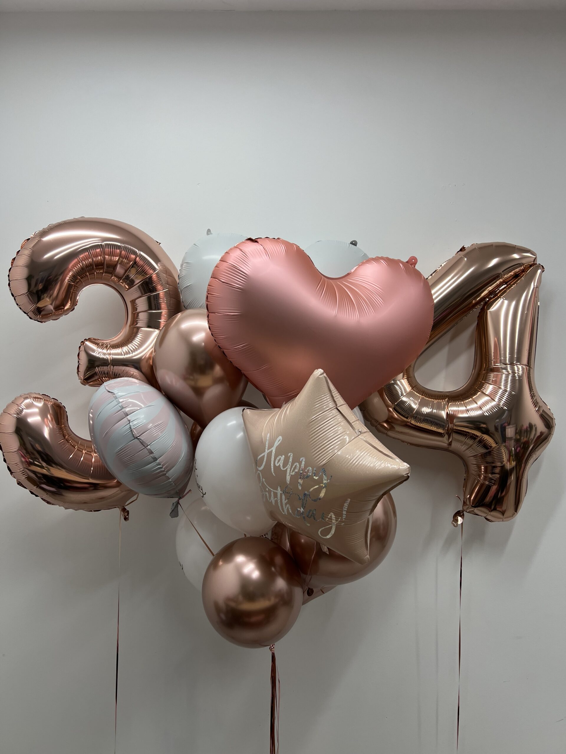 Na zdjęciu: zestaw z cyframi „2” i „4” w kolorze różowego złota. Każdy zestaw przygotowujemy indywidualnie – możesz wybrać dowolne cyfry oraz kolory balonów.