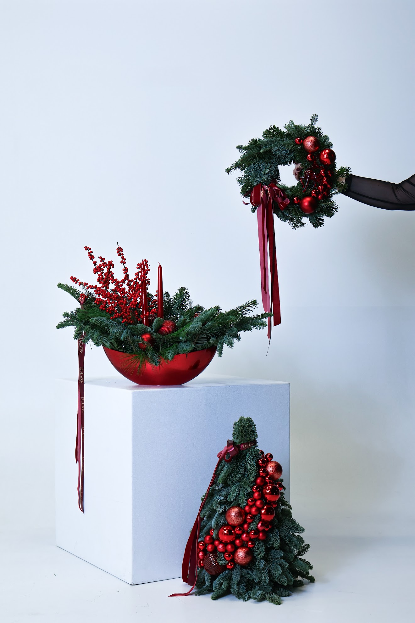 Kompletny, harmonijny Zestaw świąteczny: choinka, wianek i stroik, który tworzy spójną i efektowną aranżację w każdym wnętrzu. W skład zestawu wchodzi elegancka mini choinka ozdobiona czerwonymi bombkami, klasyczny wianek z połyskiem oraz stroik z żywego nobilisu w czerwonej misie ze świecami i gałązkami ilexu.