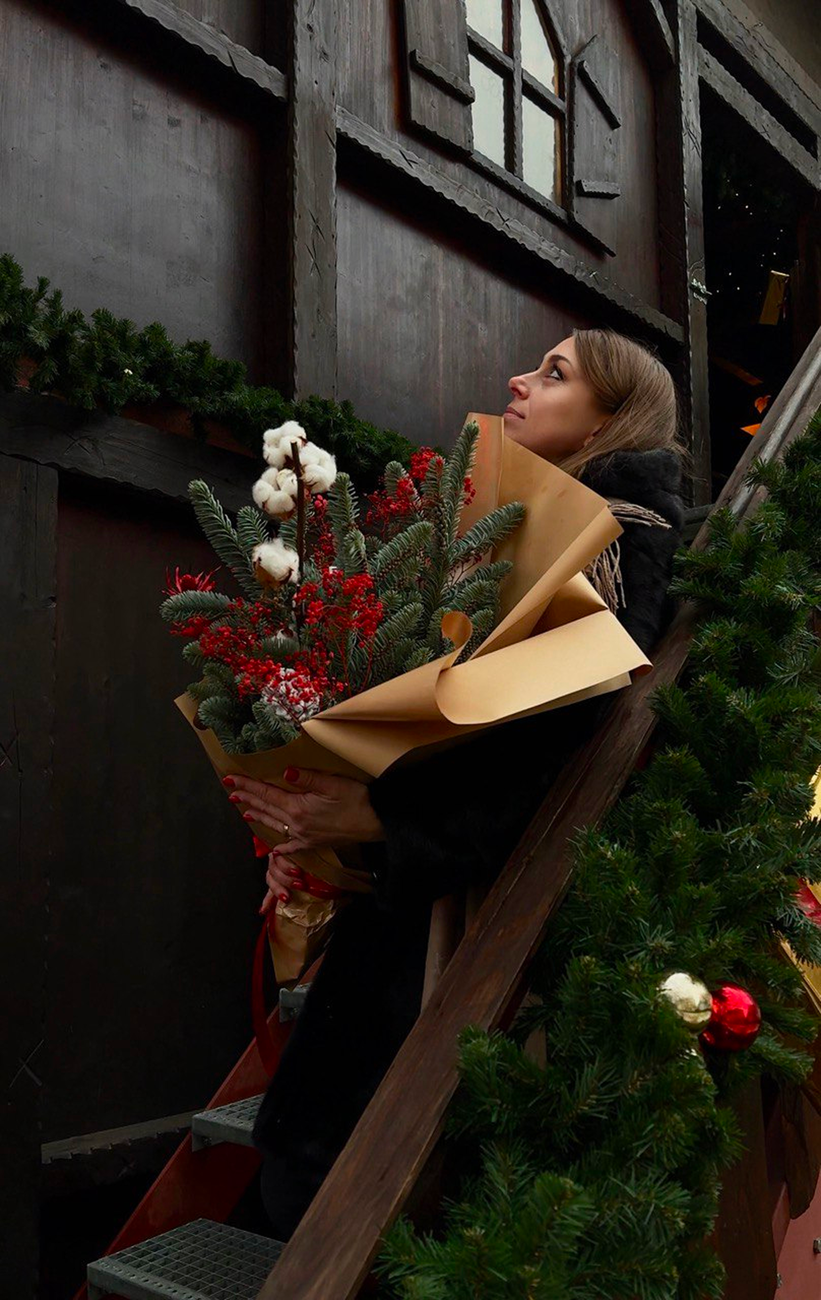 Bukiet wprowadza ciepłą, przytulną atmosferę — doskonały na prezent, zimowe spotkania, świąteczne sesje zdjęciowe oraz dekorację domu.
